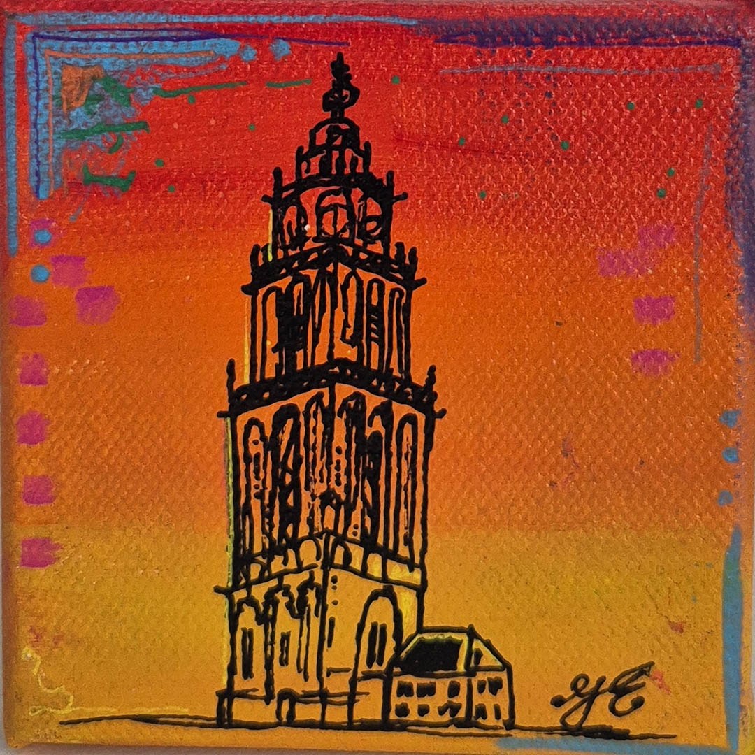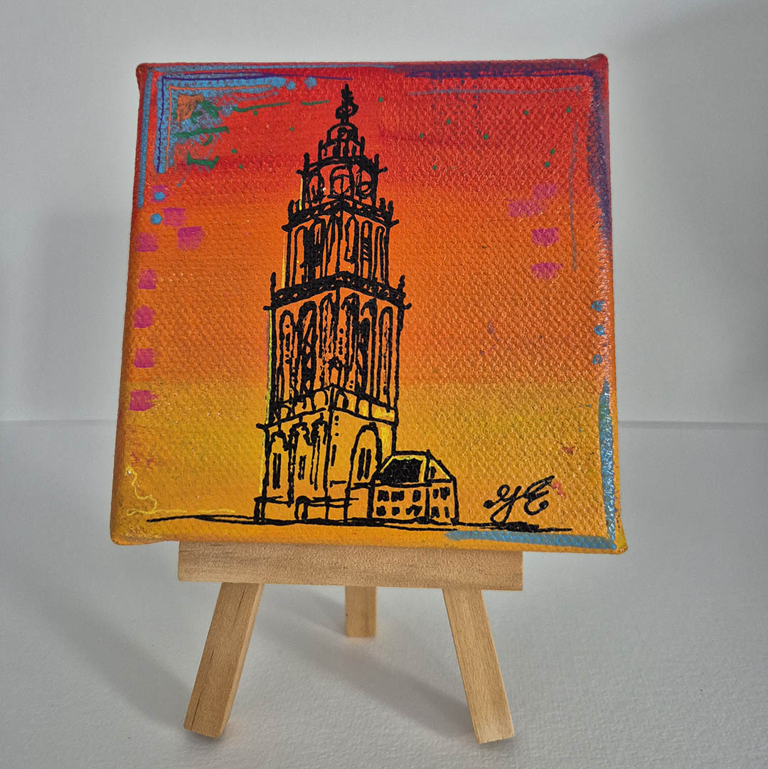 Een Martinitorentje op kwaliteit canvas van 10x10cm. Is dat niet leuk? Haal een beetje Groningen Stad in huis. Voor jezelf, als relatiegeschenk, leuk kadootje voor een (oud) stadjer, student, etc. Verkrijgbaar in allerlei kleuren en variaties. Ieder schilderijtje is uniek.