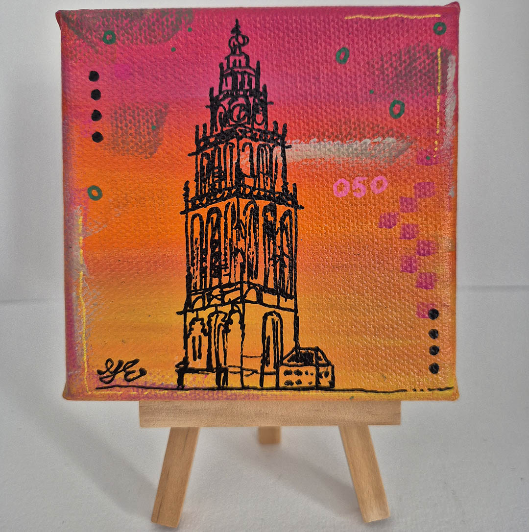 Een Martinitorentje op kwaliteit canvas van 10x10cm. Is dat niet leuk? Haal een beetje Groningen Stad in huis. Voor jezelf, als relatiegeschenk, leuk kadootje voor een (oud) stadjer, student, etc. Verkrijgbaar in allerlei kleuren en variaties. Ieder schilderijtje is uniek.